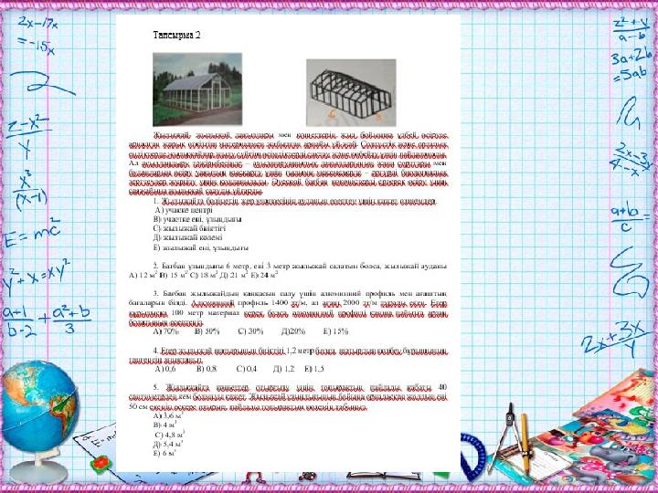 М а т е м а т и к а л ы қ с а у а т т ы л ы қ д е г е н ұ ғ ы м ғ а о қ у ш ы л а р д ы ң к е л е с і қ а б iл е т т iл iк т е р і ж а т а д ы -қоршаған ақиқат ортада пайда болатын жəне математика арқылы шешiле алатын мəселелерді тани білу; -бұл мəселелерді математика тiлiнде құрастыру; -шешiмдерде қолданылған əдiстерді талдау; -шешiмдердің нəтижелерiн құрастырып жазу. -қойылған мəселелерді есепке ала отырып нəтижелерді түсiндiру; -бұл мəселелердi математикалық айғақтар мен əдiстерді қолдана отырып шешу;