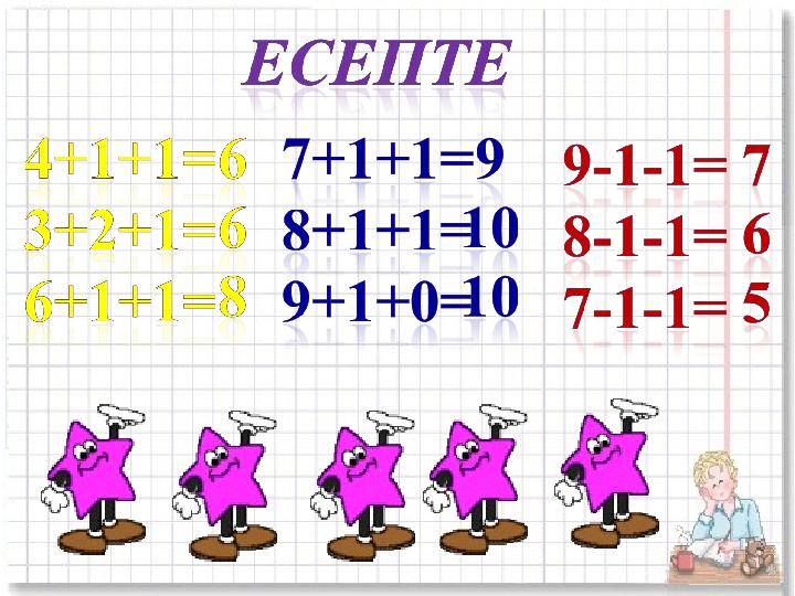 1. 10 балапан болды, 3 балапан қашып кетті. Неше балапан қалды? 2. Шыңғыста 7 теңге, Батырханда 3 теңге. Барлығы қанша? 3. Айсұлуда 5 кампит, ал Айнұрда 1 кампит кем. Айнұрда неше кәмпит кем? 4.Себетте 5 алмұрт, ал сөмкеде 3 алмұрт артық. Сөмкеде неше алмұрт? 5.7 кесе болды. 2-еуі сынды, нешеуі қалды? 6. 7 мысық болды, 2 мысық кетті. Неше мысық қалды? 7. Саябақта 6 қайың және 2 терек өсіп тұр. Теректің қайыңға қарағанда нешеуі кем?