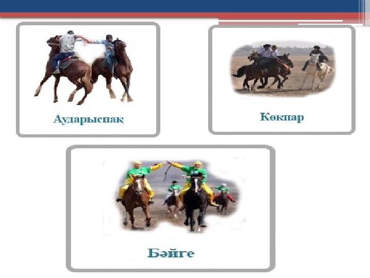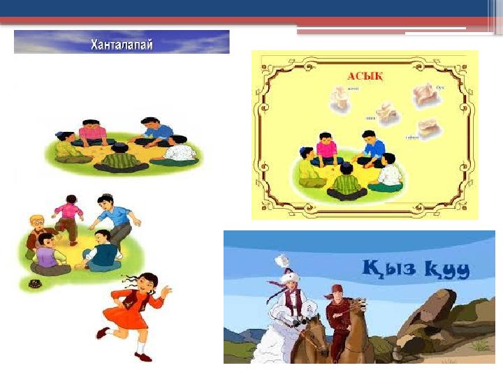 Ұлттық ойындар АҢҒА БАЙЛАНЫСТ Ы МАЛҒА БАЙЛАНЫСТ Ы ТҮРЛІ ЗАТТАРМЕН ОЙНАЛАТЫН • Ақсерек - көксерек • Аңшылар • Аңшылармен қояндар • Кірпіше қарғу • Қасқұлақ • Ордағы қасқыр • Аларман (қойға қасқыр шапты) • Асау көк • Соқыр теке • Түйе мен бота т.б • Аққала • Ақсүйек • Алакүшік • Алтыбақан • Арқан аттау • Арқан тартыс • Асық • Аттамақ • Ауыртаяқ т.б