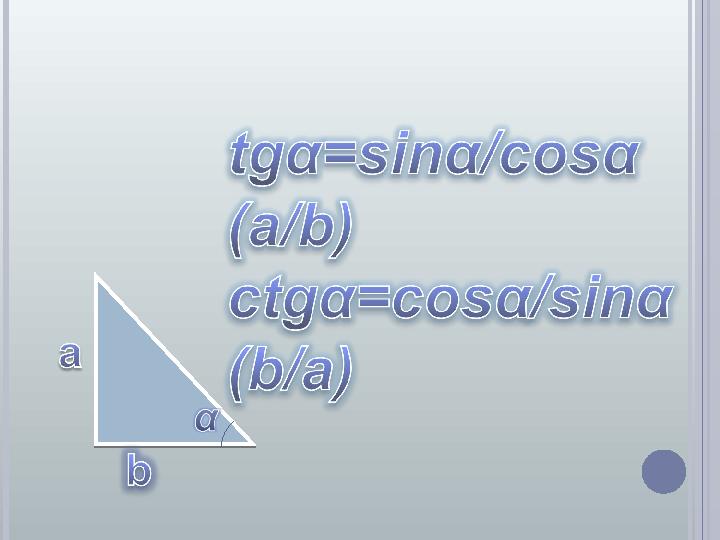 30º 60º45º αsin α α α α cos tg ctg 1 2 32 3 2 1 2 2 2 3 2 1 2 2 2 3 3 3 3 1 1 3 3 3 1 1 3 3 30 0 , 45 0 , 60 0 бұрыштары үшін мәндер кестесі