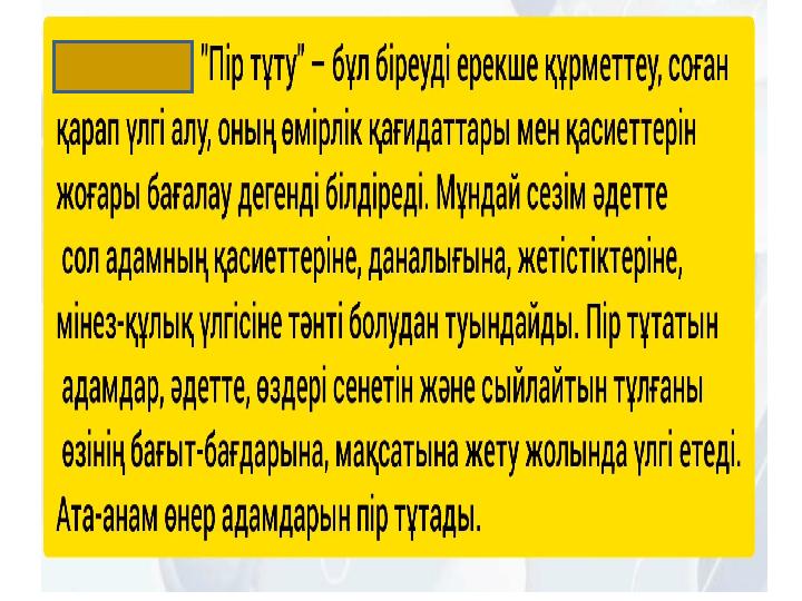 Ойтүрткі -«Пір тұту» дегенді қалай түсінесіңдер? - Қандай адамды пір тұтуға болады? - Сен кімді пір тұтынар едің?