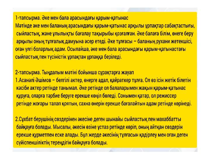 1-тапсырма. Мәтінді тыңдаңыз, сұрақтарға дәлелді жауап беріңіз. /ауызша/ 1.Әшімов әке ретінде қандай адам, режиссер ретінде қандай адам? 2.Әкеге деген сүйіспеншілік сұхбат берушінің қай сөздерінен көрінеді?