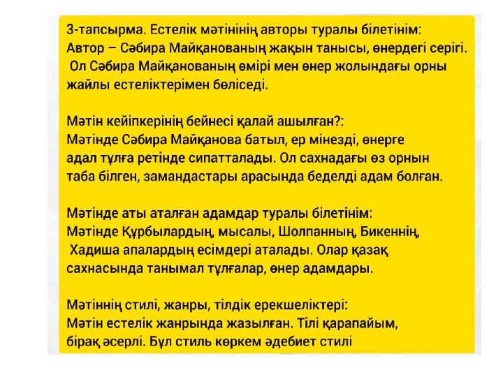 3-тапсырма. Мәтінді оқып коментарий жасаңдар Коментарийлер Автор туралы білетінім Кейіпкердің бейнесін қалай ашады? \Сәбира Майқанова\ Аты аталған адамдар туралы білетінім Мәтіннің стилі, жанры, тілдік ерекшеліктері