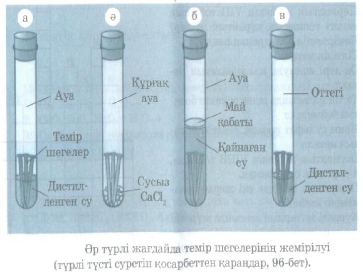 Бірінші сынауықтағы темір шеге су мен ауа әсерінен тотығады, яғни жоғарыда көрсетілген реакциялар жүреді. Ал, екінші сынауықтағы темір су тартқыш кальций хлориді салынғандықтан, әрі ауа құрғақ болғандықтан жемірілу байқалмайды. Үшінші сынауықтағы темір шеге мен ауаны май қабаты бөліп тұр және қайнаған суда оттегі жоқ, сондықтан жемірілу жүрмейді, ал төртінші сынауықта ауа таза оттегімен ауыстырылғандықтан жемірілу шабытты жүреді.