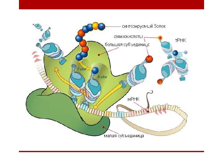 РИБОСОМАЛАР• Рибосомалар – майда шар тәрізді, диаметрі 15,0-35,0 нм денешіктер. Олар нәруыздан және р-РНҚ-дан тұрады. Рибосомалық РНҚ ядрошықта түзіліп, ядродан цитоплазмаға шығады. Әрбір рибомосома кіші және үлкен екі бөліктен тұрады.