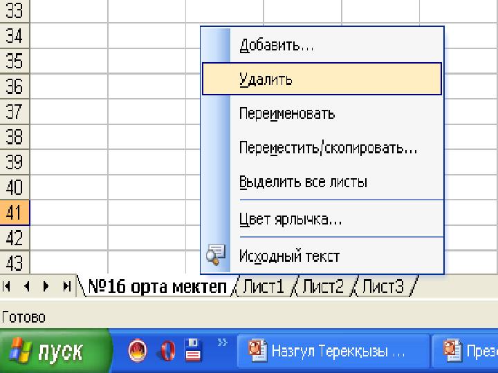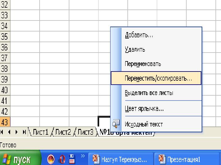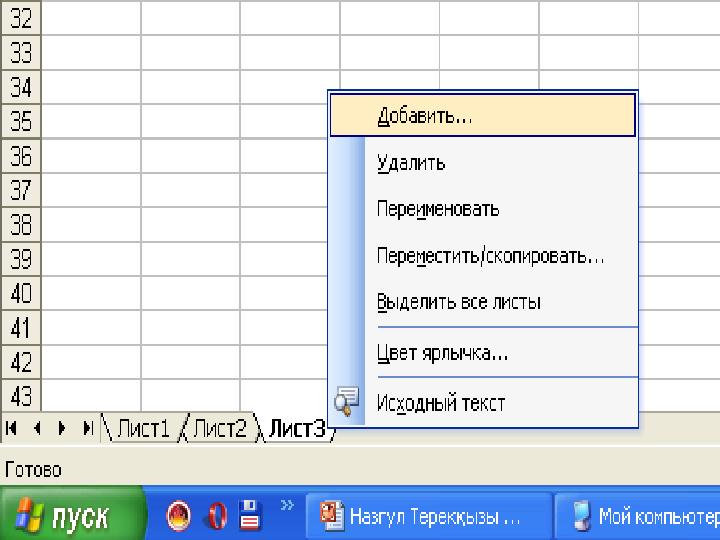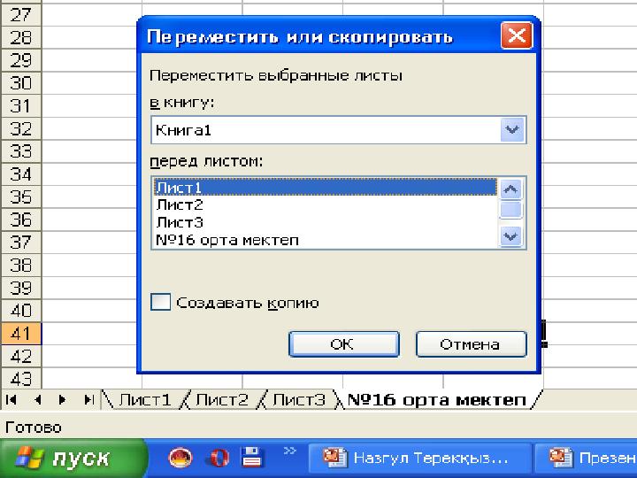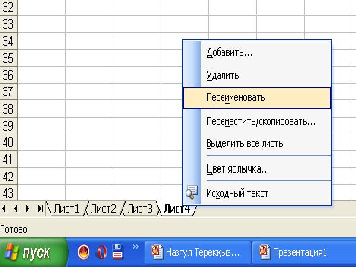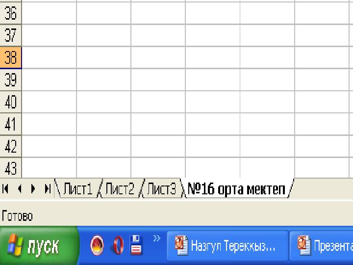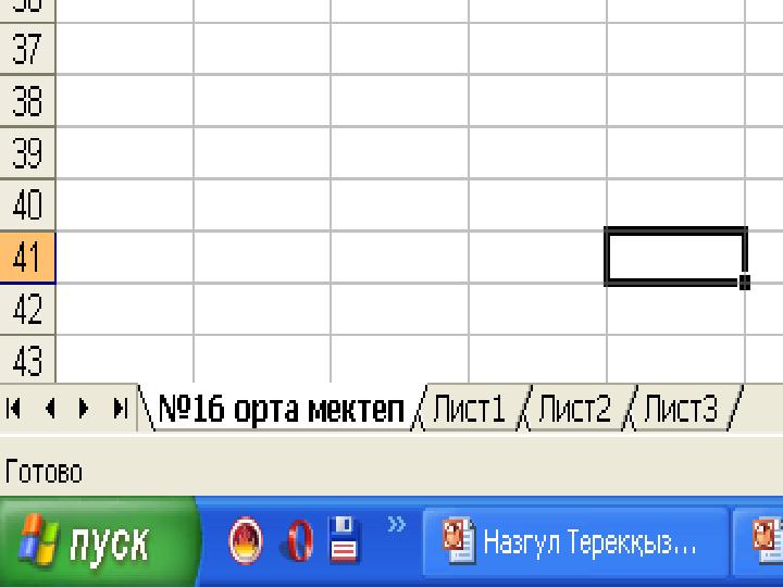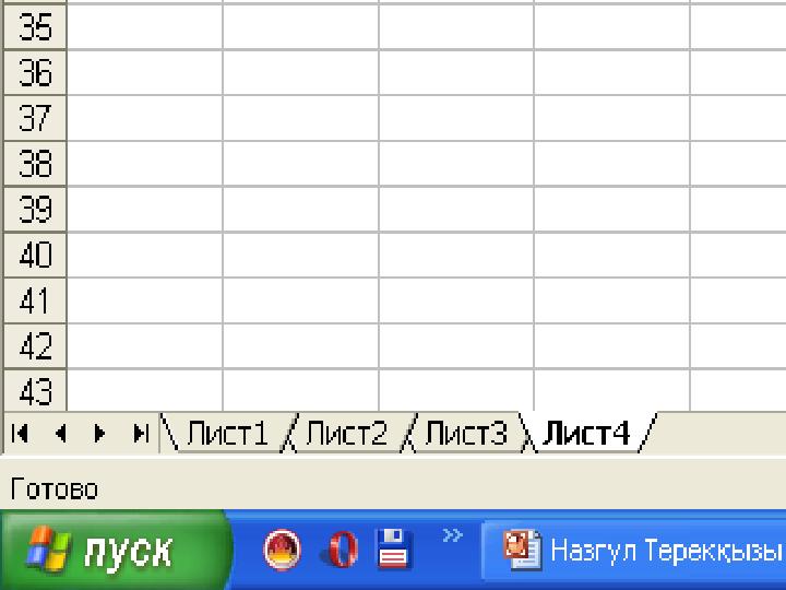 ЖЖұұмыс кітабы. Жмыс кітабы. Ж ұұмыс мыс парағы. Жолдар мен парағы. Жолдар мен бағандарбағандар Ехсеl даярлайтын күжат Жұмыс кітабы деп аталады. Жұмыс кітабы жұмыс парағынан тұрады. Жұмыс парағының күрылымы кестенің күрылымындай және ол бір немесе бірнеше кестені камтиды. Әрбір парақтын аты төменгі жағында орналасқан таңбашада көрініп тұрады. Осы таңбашаның көмегімен кітапты парактауға болады. Таңбашаны тышқанның батырмасымен екі рет шерту арқылы атын езгертуге болады. Әрбір жұмыс парағы жолдар мен бағандардан тұрады. Бағандардың аты латын алфавитінің бас әріптерімен жазылады. Бір жұмыс парағы 256-ға дейін баған санын қамти алады. Бағандар А-дан Z әріптерінің комбинацияларымен белгіленеді, ал жолдар 1-ден бастап 65536-ға дейін нөмірленеді. Жұмыс кітабы 255 бетке дейін 256 бағана 65536 жол