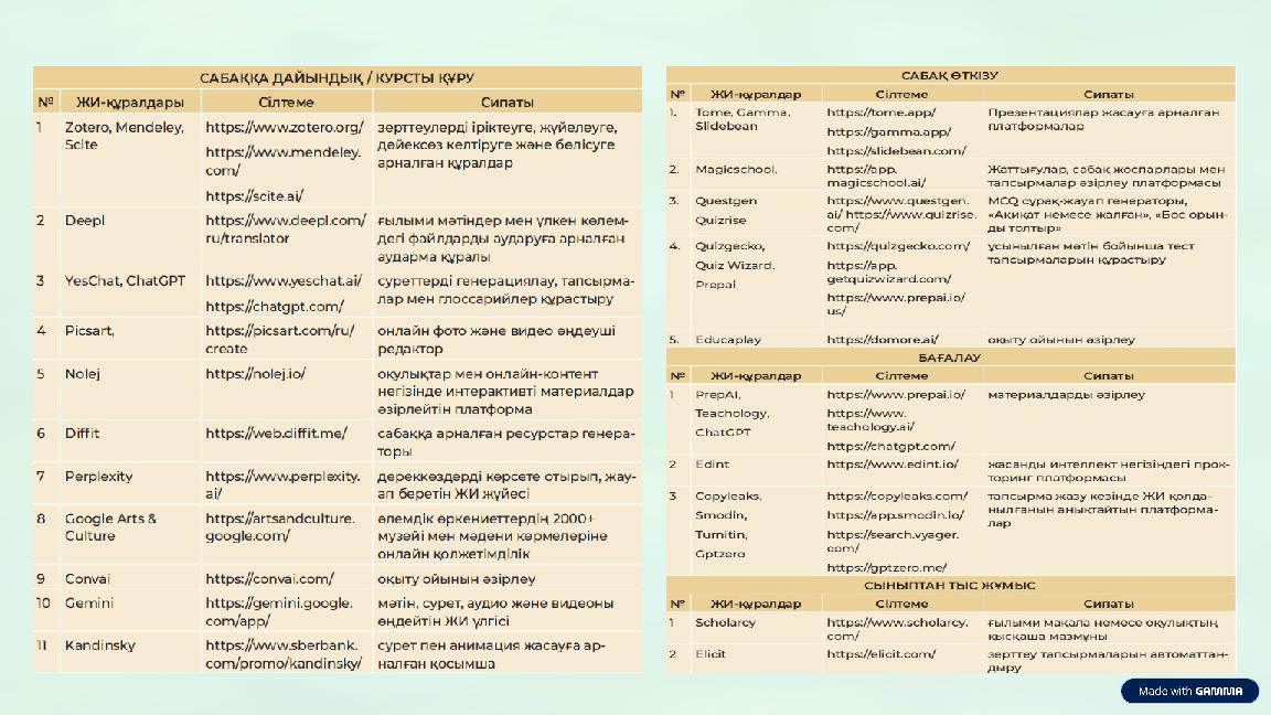 Қорытынды: Жасанды интеллект – Педагогтың Сенімді Серігі ЖИ – мұғалімнің жұмысын жеңілдетіп, оқушыларға сапалы білім беруге мүмкіндік беретін қуатты құрал. Қазірден бастап AI-ды меңгеріп, білім берудің жаңа дәуіріне бірге қадам басайық!