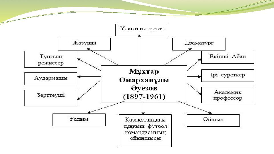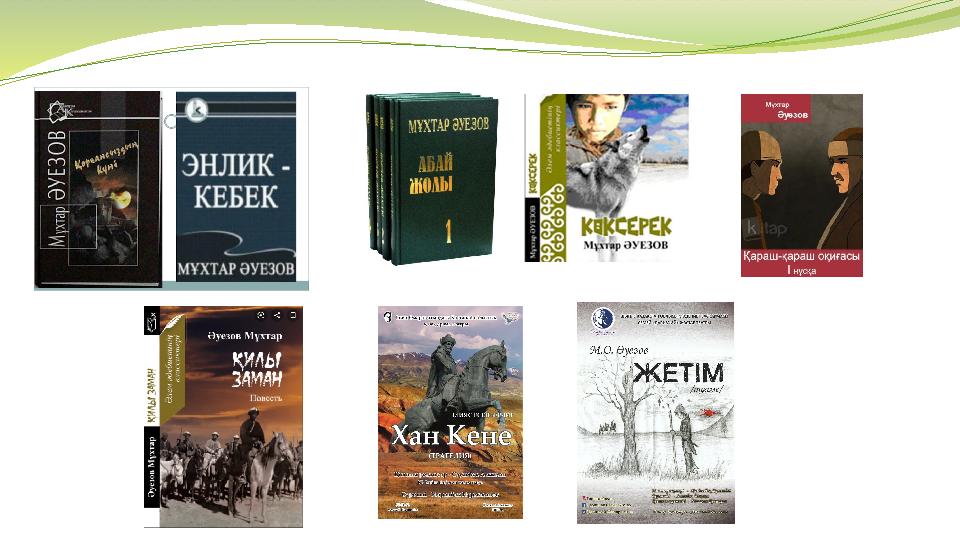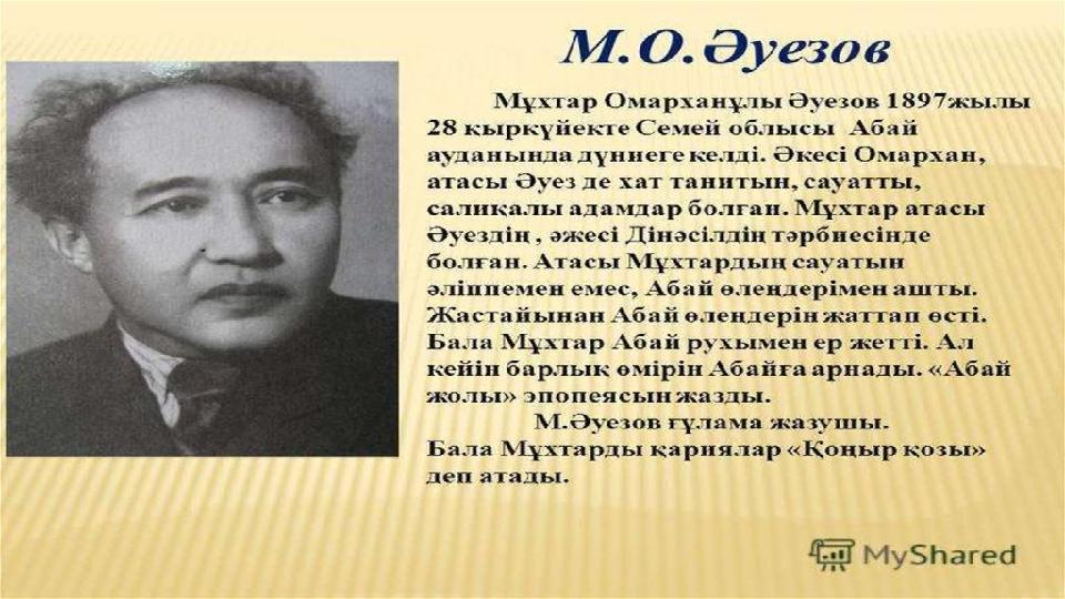 Кіріспе бөлім Әлемдік ірі құбылыс, ғұлама жазушы М.Әуезов қазақ халқының рухани байлығын бүкіл дүние жүзіне паш етті. Өзінің саналы ғұмырын қазақтың әдебиеті мен мәдениетіне, тарихы мен ұлттық өнеріне арнады. Ол әдебиеттің бар саласында да қажырлы еңбек етті. Жазушының артынан қалдырған мол мұралары публицистика, драматургия, проза, көркем аударма тұрғысынан болса, ғылыми мұрасы фольклортану, әдебиеттану сияқты ірі салаларды қамтиды. М.Әуезов – қазақ халқының ғасырға жуық өмірінің рухани шежіресін жазған, ұлт келбетін бар шындық айшықтарымен көрсете алған ірі тұлға. Ол XX ғасырдағы ең үздік шығармалардың бірін дүниеге әкелген нағыз кемел шығарманың авторы ғана емес, толғампаз зерттеуші. М.Әуезов арқылы төрткүл дүние Абайды танып, Абай арқылы Азияның кіндігіндегі көшпенділер елі тарихын зерделеп, дала пәлсапасына қанығады. Ол шәкірттік дәуірді басынан өткермей, әдеби майданға білек түре кіріскені тырнақалды шығармаларынан-ақ айқын аңғарылады. Көркем сөз құдіретін ерте ұғынған жазушы қазақ әдебиетіне құбылыс болып енді. Ұлттық сөзді биік белеске көтерді. Сол себепті М.Әуезовтің ұлы шығармалары қазақ халқының көнермес асыл мұрасы, ар-абыройы болып қала бермек. Дала данышпаны Абай – қазақтың асқар биігі, өлең сөздің үлгісі болса, қара сөздің хас шебері М.Әуезов туындылары адамзаттың рухани қазынасына айналған қымбат құндылықтардың бірі болып табылады.