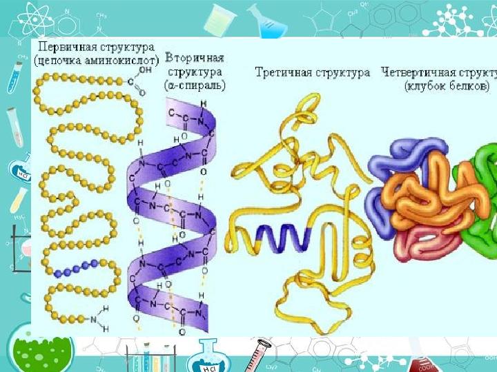 Сабақтың мақсаты: Нәруыз құрылысы, құрамы, организмдегі маңыздылығы, физикалық қасиеттері,белоктардың біріншілік, екіншілік, үшіншілік құрылымы мен таныстыру