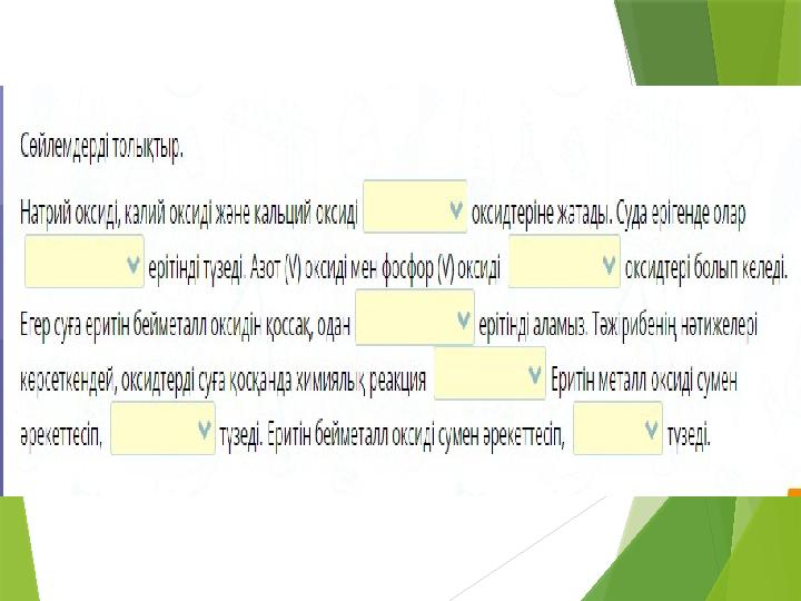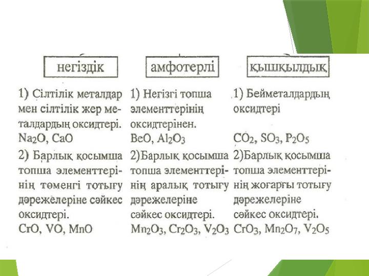 Оқу мақсаты 8.3.4.7 оксидтердің жіктелуін және қасиеттерін білу, олардың химиялық қасиеттерін сипаттайтын реакция теңдеулерін жаза білу