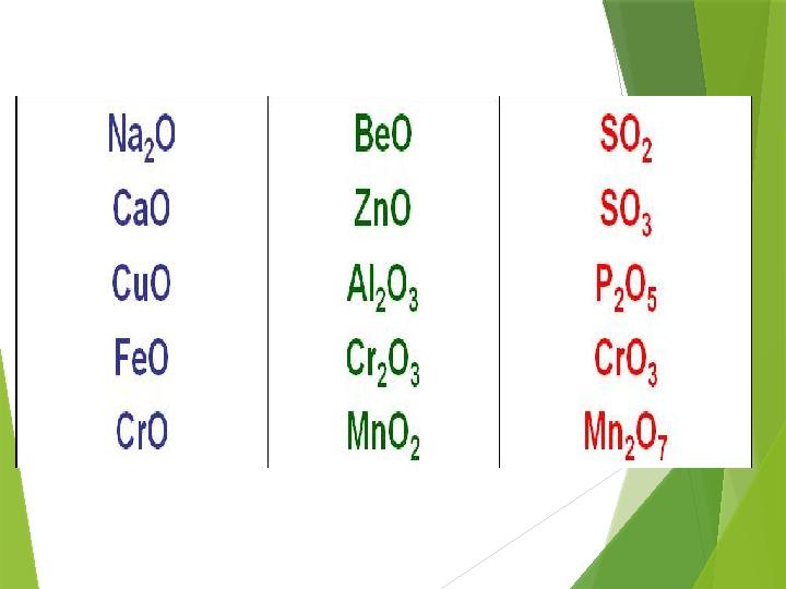 Дұрыс жауаптары: С l 2 О 7 хлор( VII ) оксиді PbO қорғасын оксиді Fe 2 О 3 т емір (ІІІ) оксиді CuO мыс оксиді СО 2 көміртек (І V ) оксиді Н 2 О сутек оксиді