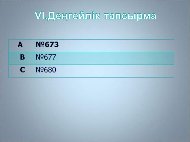 Үй тапсырмасы:Үй тапсырмасы: Ереже жаттауЕреже жаттау № № 673, 677673, 677