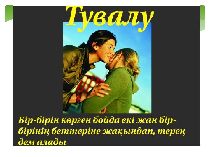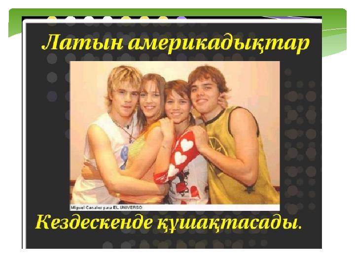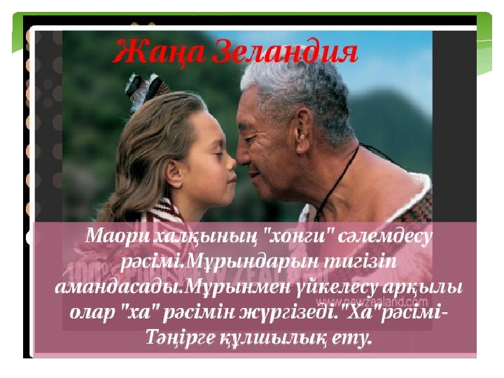 *Қазақтар қол алысады, *италяндықтар құшақтасады, *бразилиялықтар бір бірінің иығын қағады, *зимбавеліктер арқасымен амандасады, *македондықтар шынтақпен амандасады, *никарагуалықтар иықпен амандасады, *австралиялықтар шапалық ұрып секіреді Амандасу рәсімі: