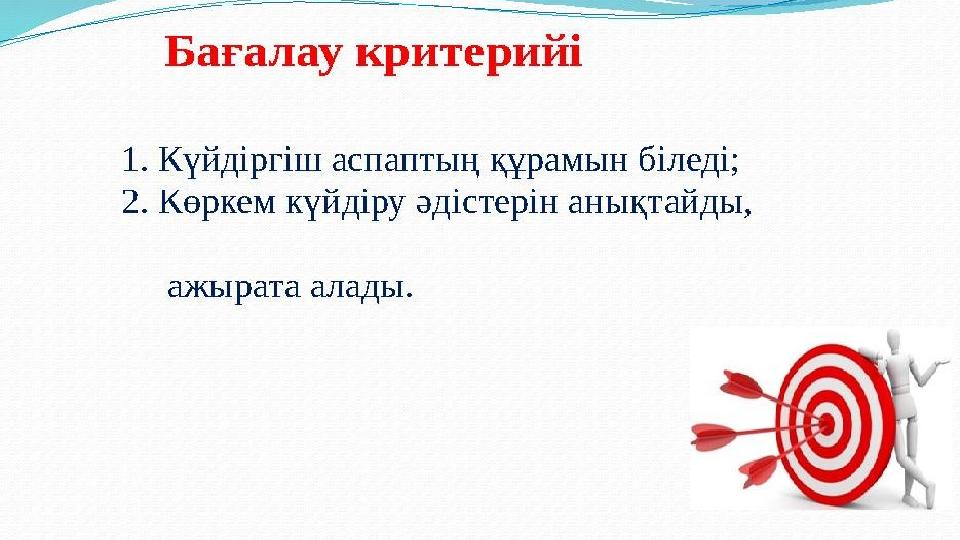 Сабақтың мақсаты: •Шығармашылық жұмыста идеяларын іске асыру мақсатында түрлі ақпарат көздерінің ең тиімдісін таңдай отырып, қолдануды үйрету •Оқушыларды электр күйдіргішінің құрылысымен таныстырып, қолдану тәсілімен таныстыру.