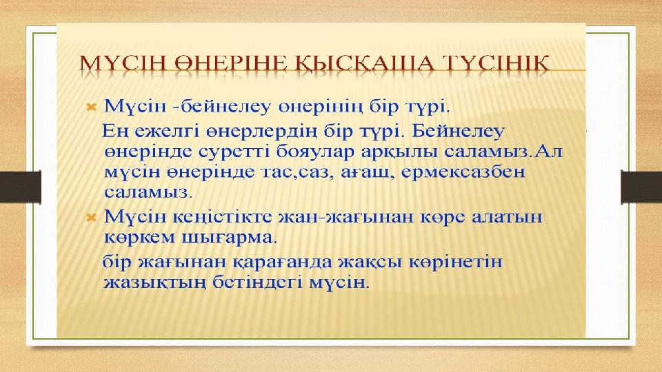 Оқыту мақсаттары Сабақ мақсаттары Тілдік мақсаттар 5.2.1.1 Өз идеялары мен сезімдерін беру үшін қоршаған ортаның визуалды элементтері мен өнердің көркем тәсілдерін қолдану. 5.3.3.1 Пәндік терминологияны қолдана отырып, өзінің және өзгелердің (суретшілер, қолөнершілер, дизайнерлер) жұмыстарындағы қолданылған әдіс-тәсілдерді (техникасы) сипаттау. 1. Оқушылар мүсін өнері және оның түрлері туралы түсініктерін қалыптастырады. 2. Мүсін өнерінің түрлерін ажырата алады,ерекшеліктерін біледі. 3. Мүсіндеуге қажетті материалдармен танысу,олармен жұмыс жасау тәсілдерін үйренеді. Өнердің қайта өркендеуі, импрессионизм, экспрессионизм,заманауи өнер, кескіндеме, графика, мүсін, сәулет өнері,пейзаж, натюрморт, дақ, штрих, көлем, форма, кеңістік, түс, сызық.