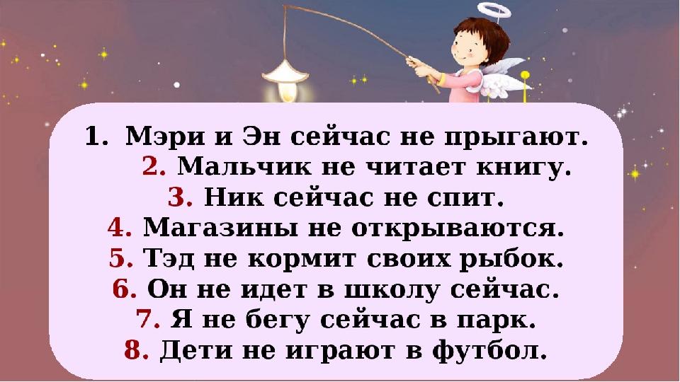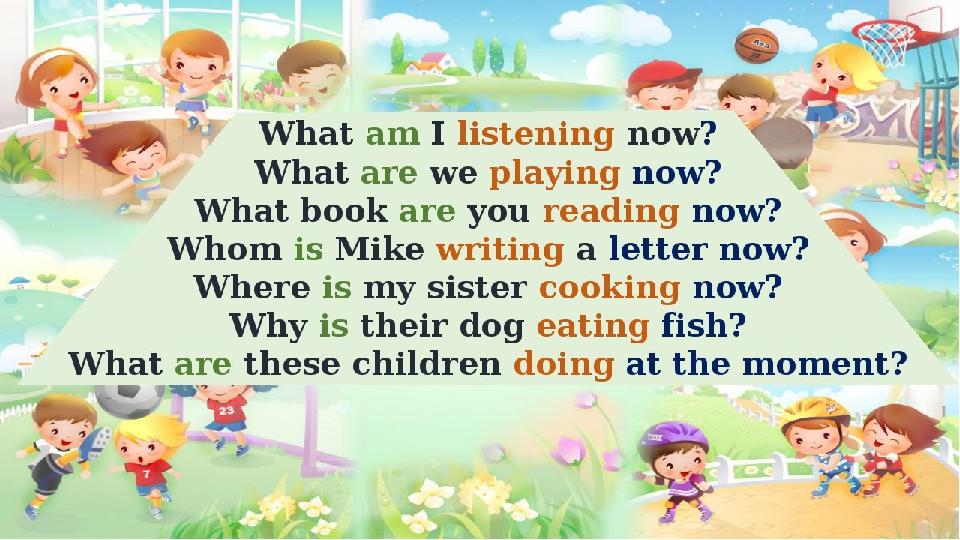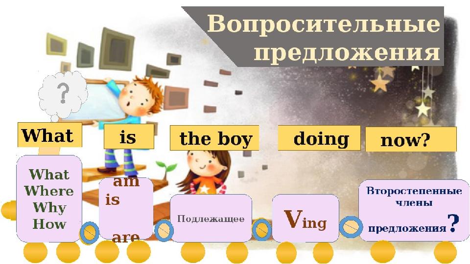 Волшебник задает много вопросов своим братьям и жителям королевства. Ему интересно как и чем они живут. •А делает он это так: Am, is, are + подлежащее+ V-ing? Например: - Is your mother cooking at the moment? Твоя мама готовит кушать сейчас? Yes, she is (No, she is not). Да.