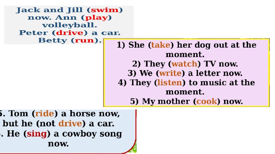 Look at the poster and write a letter to Larry or Lulu. What are the children in the park doing? Fill in the gaps. Hello, Larry! (Hello, Lulu!) The day is nice, and I’m writing you a letter now. There is a park near my house. I’m sitting at the window and watching my friends in the park. Mike has got a new car. He is driving the car. Sue likes films. She is watching TV now. Look! Peter is in the sandbox. He is making a big sandcastle. Oliver and Kate are friends. They are playing a game. Sarah likes to draw. She is painting a picture now. We are all having fun. Bye for now, write be sit watch have got drive like watch be make be play like paint have