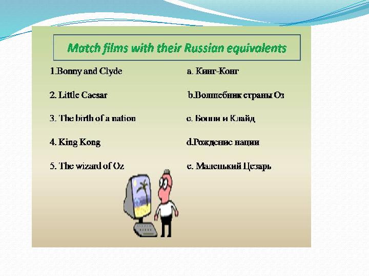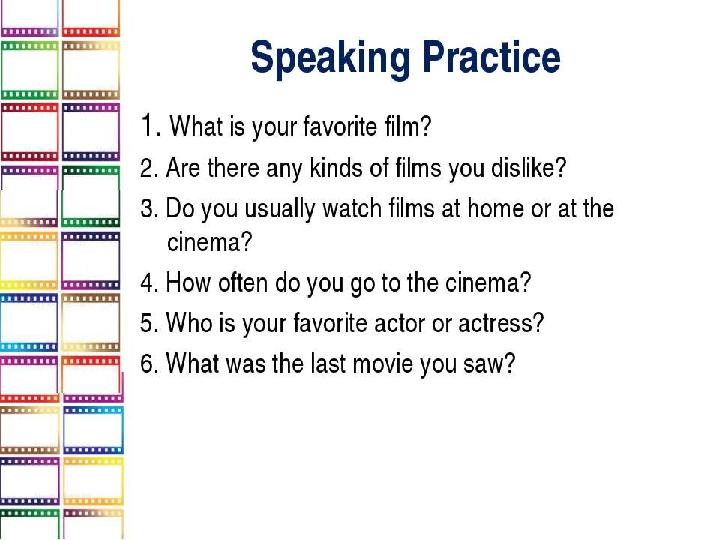Types of films 1. a fantasy film 2. a horror film 3. a historical film 4. an action film 5. a musical 6. a science fiction 7. a romance 8. a comedy 9. a cartoon 10. a western film