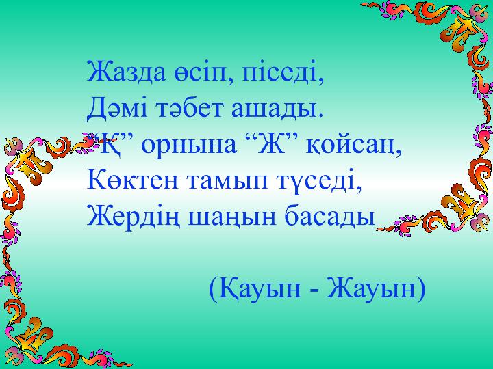 а а б и п р б т ц и с л д ж ф ы н о б з к а с п и й ж б ң ы в ғ а қ қ а й ы ң ю с е к с е у і л с ф ф н қ а р а а ғ а ш я м а г щ з ы ы л д и н н ш ф в п р ж ж Әріптер кестесінен ертегідегі ағаш аттарын тауып жазу