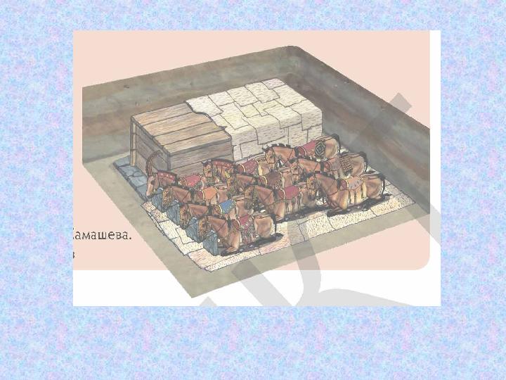 Тапсырма № 4 Берілген сөз тіркестерінің арасынан Берелдің №11-обасынан табылғандарын обаның төменде берілген көшірмесіне жина. 16 аттың қаңқасы 13 жирен жылқы Ер адамның денесі Алтын бесжұлдыз Тері бетпердеАлтын семсер Берел № 11 оба