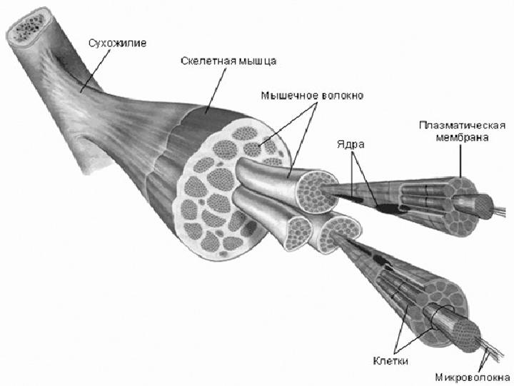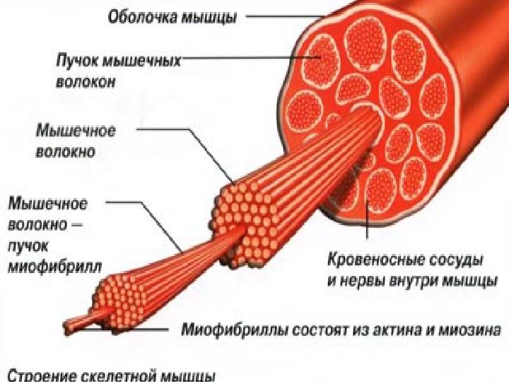 Бұлшықет жасушалары ұзын,жіңішке болғандықтан оларды талшықтар деп атайды. Бұлшықет талшығы топтасып, бұлшықет шоғырын құрайды Әрбір талшық қатарласа орналасқан жіңішке жіпшелерден тұрады.Оны миофибрилла деп атайды.