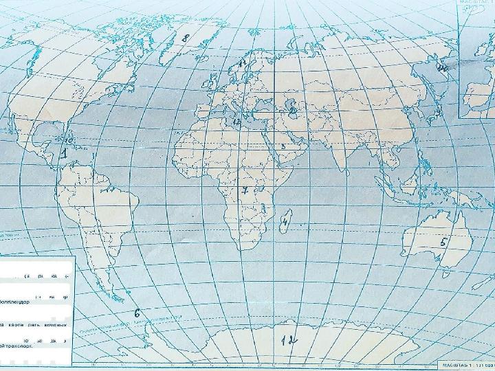 Задание 2 индивидуальная работа (по контурной карте) Нахождение объектов по контурной карте. Географические объекты обозначенные цифрами. Нужно указать в тетради какой цифре соответствует объект •Карибское море •Каспийское море •Аравийский полуостров •остров Мадагаскар •Австралия •пролив Дрейка •Африка •Гренландия •Япония •Куба •Скандинавский полуостров •Антарктида •Средиземное море •Камчатка