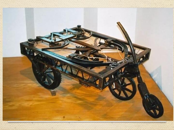 Самоходная тележка, предположительно предназначенная для театрального использования, была разработана Леонардо для перемещения без толкания с помощью человека. Аппарат, приводимый в действие спиральными пружинами, был оснащен тормозами и системами рулевого управления.