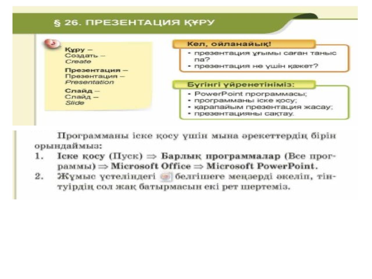 §26-27 Презентация құру. Презентацияны безендіру 3.1.2.4 компьютерлік программаларда меню командаларын қолдану; 3.2.3.1 мәтін мен видеолардан тұратын қарапайым презентациялар жасау; 3.2.3.2 слайдтар арасындағы ауысуларды пайдалану; 3.2.3.3 презентацияны безендіру үшін дайын дизайнды пайдалану; 3.3.1.1 нақты сұрақтарға жауап табу үшін Интернеттің іздеу жүйелерін қолдану