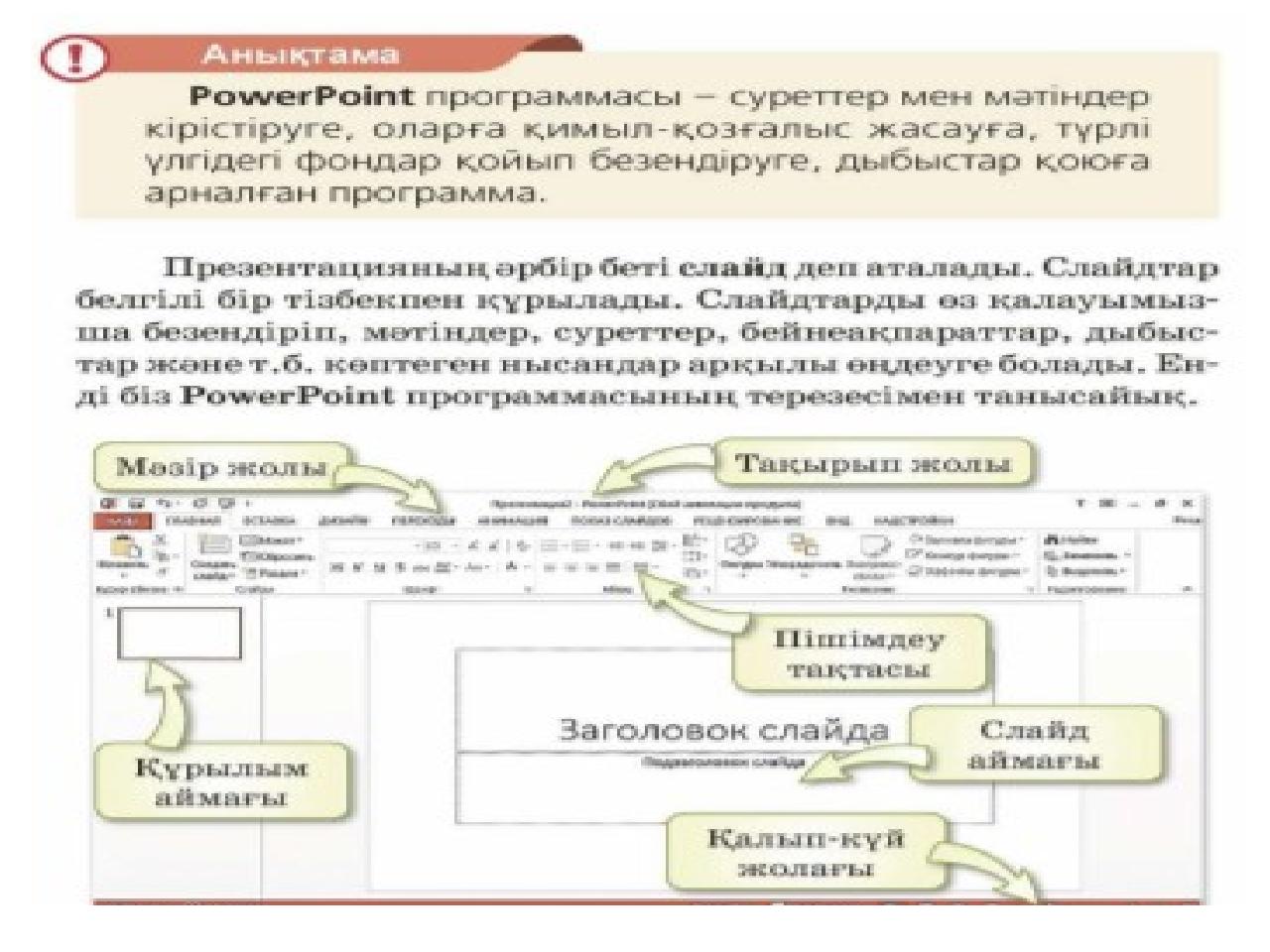Үй тапсырмасы: §26-27 Презентация құру. Презентацияны безендіру тақырыптарын оқу. Слайд деген не? Слайдты қалай іске қосуға болады? Слайдты қалай сақтайды? Слайдты толық режимде қалай көреді?