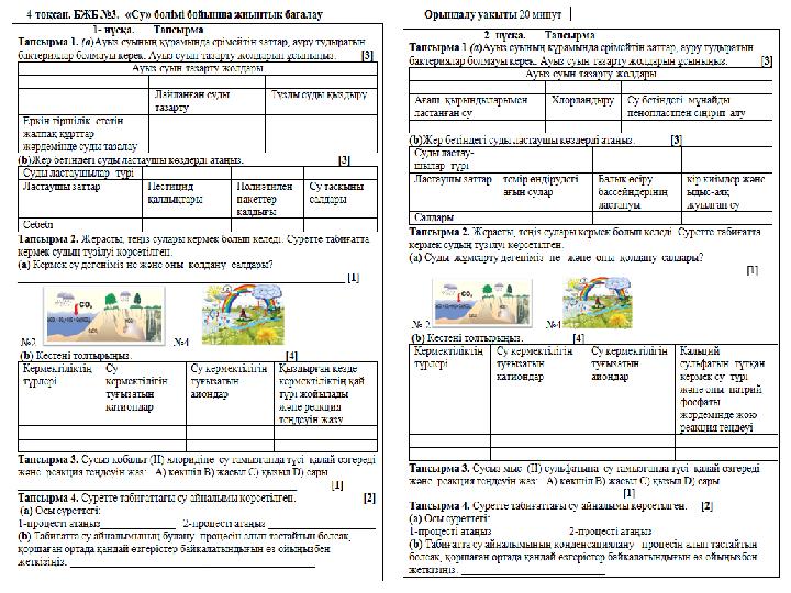 Суды тазарту әдістері 1.Механикалық – сүзу, тұндыру 2.Химиялық - әр түрлі реагенттерді қосу арқылы құрамын жақсартуға бағытталған. М: хлорландыру 3. Физико-химиялық - су буымен айдау, сорбция, суды ультрадыбыспен өндеу, электрохимиялық тотықтыру, қышқылдармен және сілтілермен бейтараптау4.Биологиялық - суларды тазартудың биологиялық әдісі биохимиялық процесстің көмегімен жүргізіледі.Мұнда бактериялар, бір жасушалы ағзалар, жалпақ құрттар процеске қатысады .