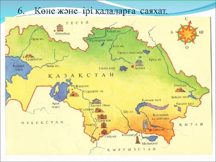 1.Ұйымдастыру. 2.Өткен материалды қайталау. 3.Сөздікпен жұмыс. 4. Жаңа сабақ. Сызба бойынша жұмыс. 5.Бекіту. Тұжырымдама. 6.Көне және ірі қалаларға саяхат жасау. 7.Ой түйіндеу. 8.Тілдесім. 9. Қорытынды. 10. Үй тапсырмасын беру.