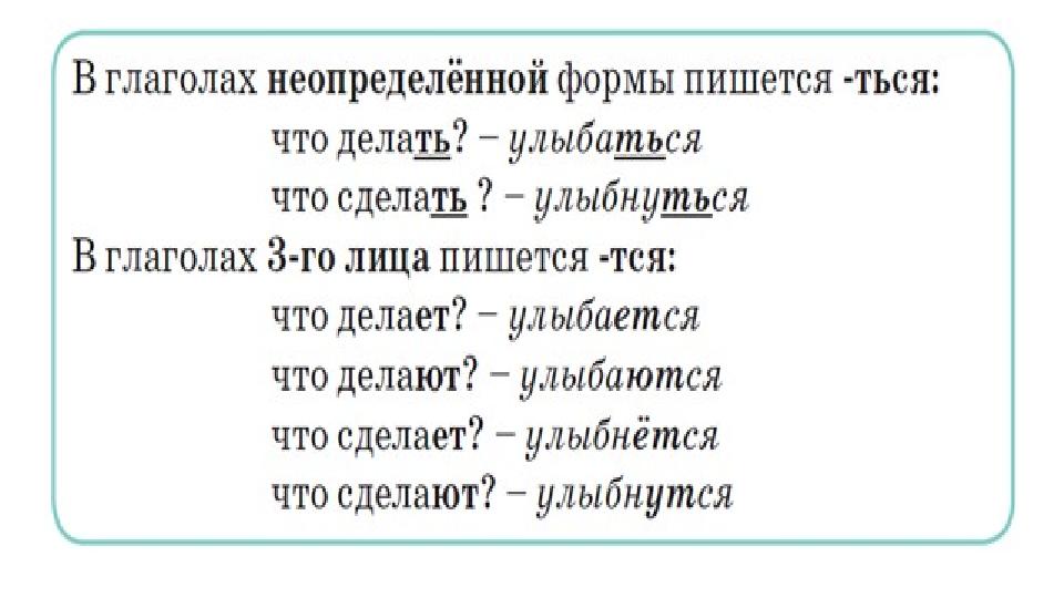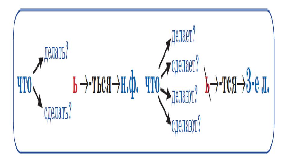 Получи тся Сломаю тся Становя тся Нуждаю тсяНаучи ться Заботи ться Обраща тьсяГлаголы Н.ф. Что дела ть ? Что сдела ть ? Глаголы 3-го лица Что дела ет ? Что дела ют ? Что сдела ет ? Что сдела ют ?