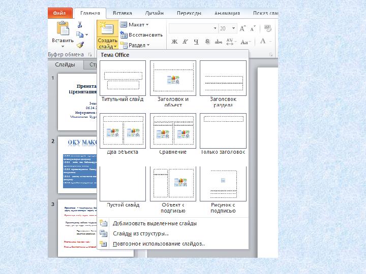 Слайдқа фон қою үшін Дизайн мәзірінен дайын фондардың бірін