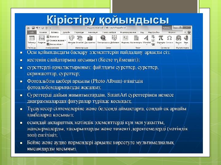 Мақсаты: М S PowerPoint бағдарламасында құрылған презентацияға мәтін, сурет, дыбыс және видео кірістіруді үйрету. Кірістіріл