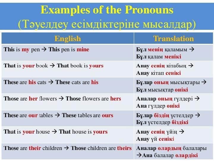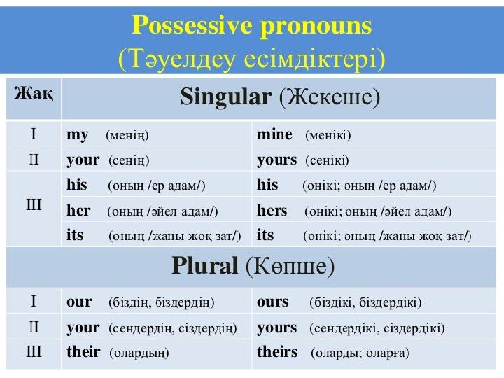 (сенің, сіздің, сіздердің), his (оның), her (оның), its
