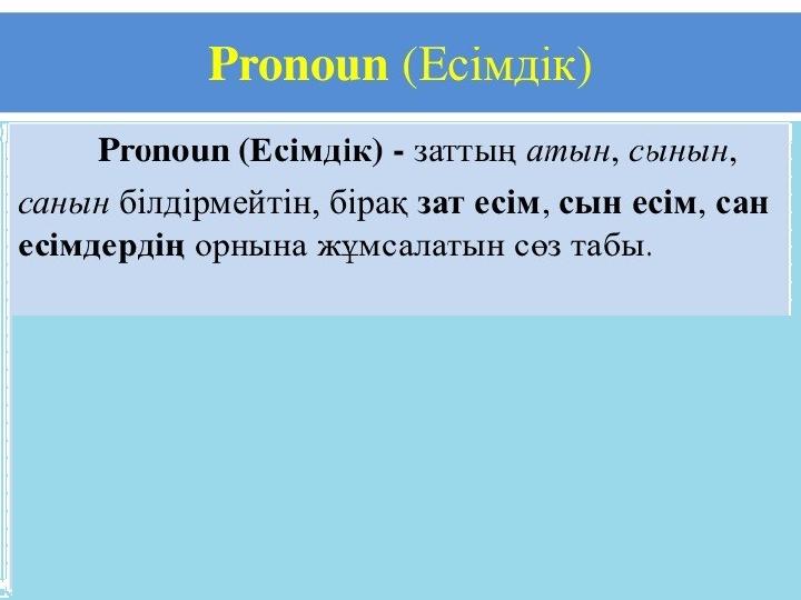 Есімдіктер (ағл.: Pronouns) — тұлғаға, затқа, заттың сынына және санына, үстеуге сілтеме жасап (олардың орындарын ауыстырып), бірақ оларды атамай, басқаша сөздермен (есім сөз дермен алмастыратын сөз табы) For example: John studies at Alash National University. He is one of the best students — Джон Алаш Ұлттық Университетінде оқиды. Ол — үздік студенттердің бірі. .