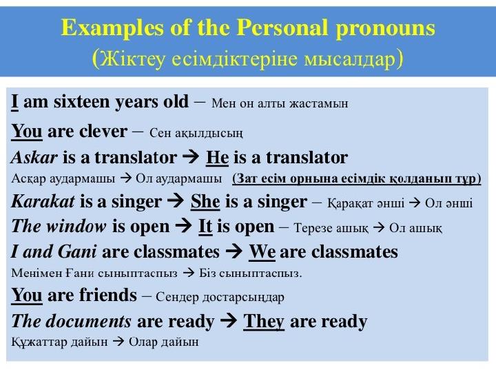 сіз), he (ол — еркек), she (ол — әйел), it (ол —