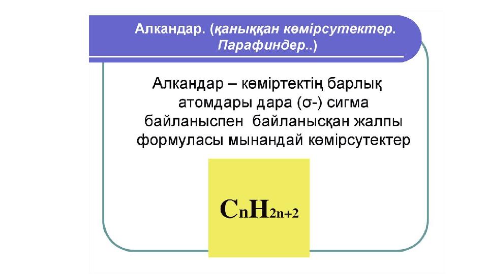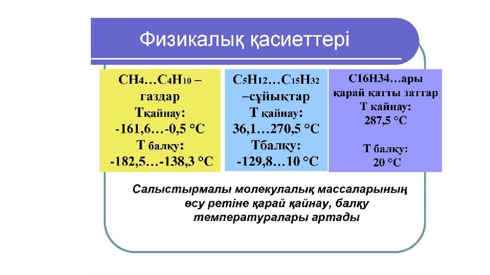 Оқу мақсаты: -10.4.2.7 әр түрлі алкандардың жану процесін зерттеу және олардың отын ретінде қолданылуын түсіндіру -10.4.2.8 алкандардың жану өнімдерін және қоршаған ортаға экологиялық салдарын бағалау Бағалау критерийлері: -Алкандардың жану реакция теңдеулерін құрастыра алады -Алкандардың отын ретінде қолданылуын сипаттайды -Алкандардың қасиеттерін қарастырады