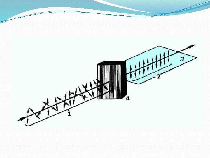 Жарық поляризациясы Табиғи жарық деп жарық сәулесін құрап тұратын әрбір жарық толқынының электр және магнит кернеулік векторларының кез - келген бағытта бағдарлануын айтады. E а) б) в) а) табиғи жарық; б) жартылай поляризаци яланған жарық; в) жазық поляризацияланған жарық.