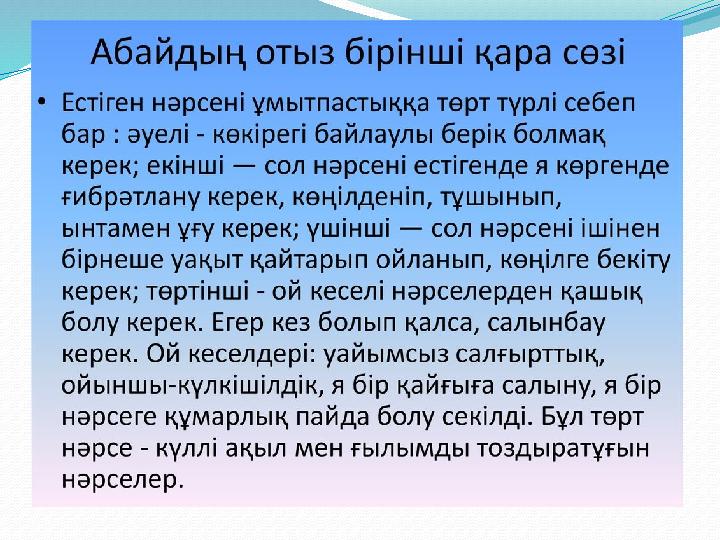 Жетінші сөз Жас бала ата-анадан туғанда екі түрлі мінезбен туады: біреуі-ішсем ,жесем , ұйықтасам деп тұрады. Бұлар-тәннің құмары , тән жанға қонақ ьола алмайды, һәм өзі өспейді,қуат таппайды.Біреуі- білсем екен демектік...