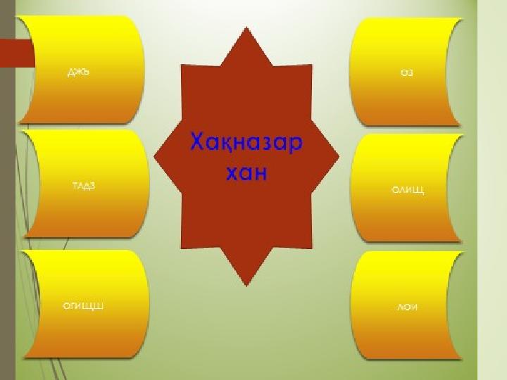 « Оқып шық ! » басқатырғышы. Егер сөздерді дұрыс жазып шықса, онда « Есім ханның ескі жолы » заңдар жинағына байланысты қолданылатын сөзді оқуға болады. 1. 1.Бірінші қазақ –бұхар шайқасы болып өткен жер 2. Бұхара ханы 3. Тұрсын ханның ставкасы 4. Жоңғарлар 5. Тұрсын ханға қолдау көрсеткен ру. 2 5 4