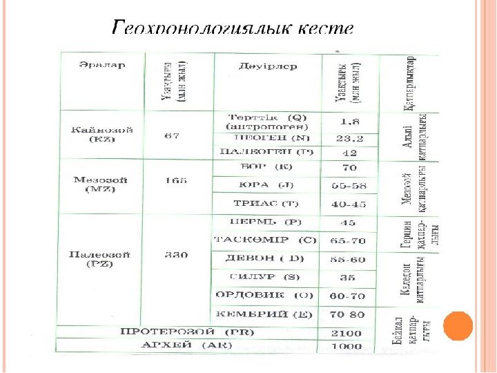 Геохронологиялық кесте 1900 жылы Дүниежүзілік геологиялық конгресте бекітілген (1-кесте). Ол да ұдайы жетілдіріліп отырады. Жер қыртысының даму тарихындағы эралар-ұзақ кезеңге топтастырылған. Жер тарихы бес эраға бөлінеді. Ең алғашқы тіршілік бастамасы Жердің көне геологиялық тарихына байланысты. Бұл уақыт архей (грекше археос – «көне тіршілік») деп аталады. Одан кейінгі уақыттар протерозой (грекше протерос – «алғашқы»), палеозой (грекше палеос – «ескі»), мезозой (грекше мезос – «орта»), кайнозой (грекше кайнос – «жаңа») болып бөлінеді. Эралар өз кезегінде дəуірлерге бөлінген. Əдетте, олардың атаулары шөгінді жыныстардың алғашқы табылған орындарына қарай, жергілікті жер атауларына (кембрий, девон, пермь, юра) немесе халықтардың атына (ордовик, силур), жыныстардың құрамына (тас көмір, бор) байланысты аталады.