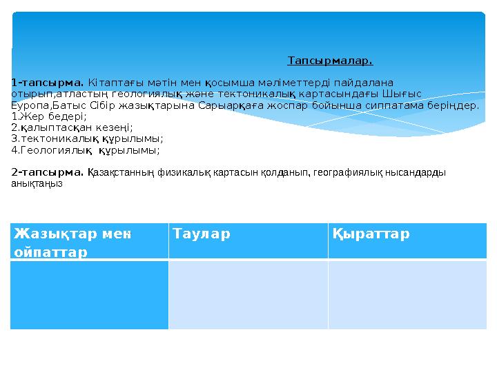 Тапсырмалар. 1-тапсырма. Кітаптағы мәтін мен қосымша мәліметтерді пайдалана отырып,атластың геологиялық және тектоникалық картасындағы Шығыс Еуропа,Батыс Сібір жазықтарына Сарыарқаға жоспар бойынша сиппатама беріңдер. 1.Жер бедері; 2.қалыптасқан кезеңі; 3.тектоникалық құрылымы; 4.Геологиялық құрылымы; 2-тапсырма. Қазақстанның физикалық картасын қолданып, географиялық нысандарды анықтаңыз Жазықтар мен ойпаттар Таулар Қыраттар ..