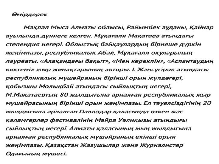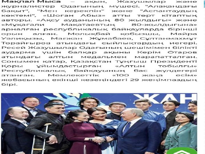 Мақсаты Қазақстандағы жүз жаңа есім табысты адамдар туралы және Мақпал мыса туралы мағұлмат беру Оқушыларға жүз жаңа есім және Мақпал Мыса туралы ой-өрісін дамыту Оқушыларды Отанын сүюге,үлкенді құрметтеуге тәрбиелеу