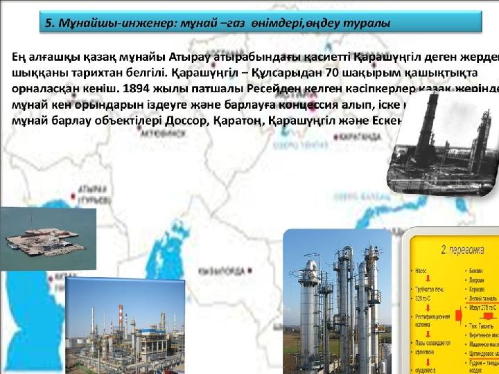 Ең алғашқы мұнай кен орындары- Қарашүңгіл • Ең алғашқы мұнай кен орны-Қарашүңгіл • (1899 ж) • Кейінрек Доссор • (1911 ж) • Содан соң Мақат ашылды. (1915ж) • Бұл аталған кен орындары Атырау облысында орналасқан .Орал-Ембі бассейіндеріне енеді . • Мұнай шикізаты-жеңіл майлы, зымыран отынын, қымбат материал майлау материалдарын өндіруге жұмсалады.