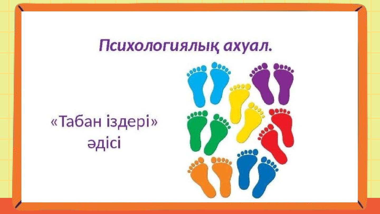 Психологиялық ахуал Оқушылар сынып есігінде тұрған түрлі стикерлермен мұғалімге амандасып табан іздерімен жүріп отырып өз орнына отырады. (көңілді музыка қосылып тұрады).
