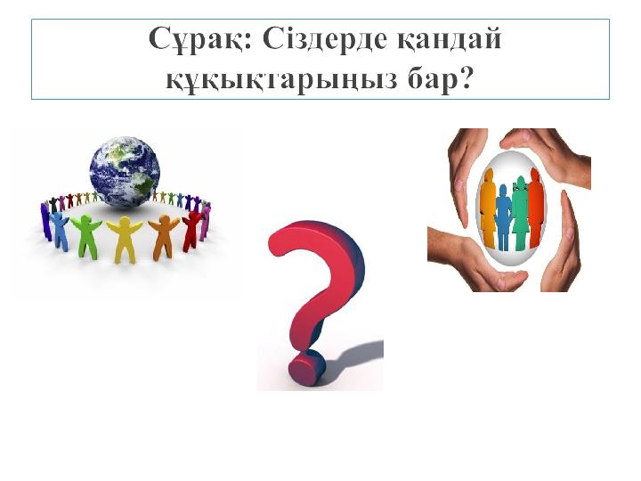Құқықтардың атаулары Дұрыс жауаптар Құқықтар Жеке құқықтар және бостандықтар 1, 2 1. Әркімнің өмір сүруге құқығы; 2. Әркім өзінің қай ұлтқа, қай дінге жататынын анықтауға құқығы; Экономикалық құқықтар 5, 7 3. Денсаулығын сақтауға құқығы; 4. Тегін орта білім алуға құқығы; 5. Жеке меншігіне құқығы; Әлеуметтік құқықтар 3, 4, 8, 106. Мемлекеттік қызметке кіруге тең құқығы; Саяси партияларға кіру құқығы; 7. Әркімнің кәсіпкерлік қызмет еркіндігіне; Мәдени құқықтар 9 8. Әркімнің тынығу (демалуға) құқығы бар; 9. Әркімнің ана тілі мен төл мәдениетін пайдалануға; Саяси құқықтар 6 10. Әркімнің еңбек ету бостандығына, қызмет пен кәсіп түрін еркін таңдауына құқығы.