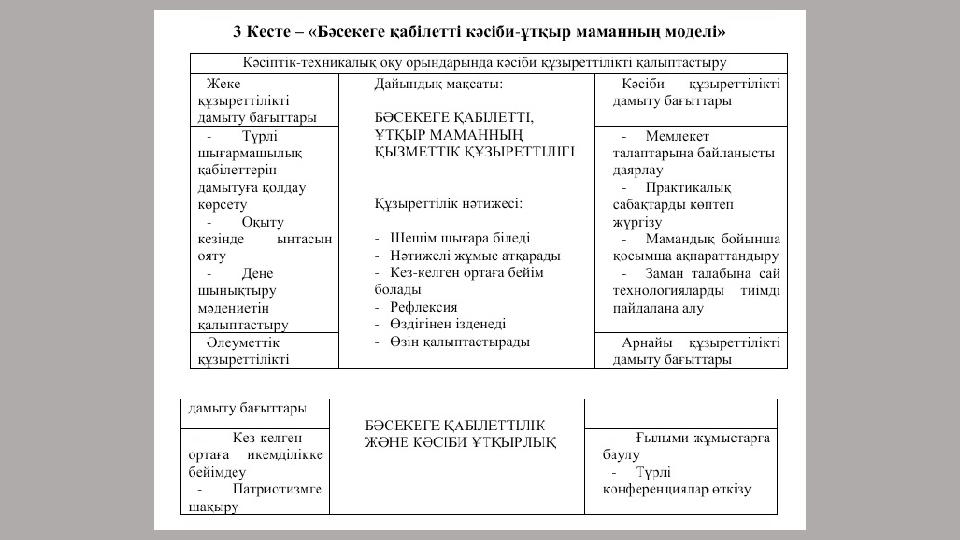 Құзіреттілікті дамыту бағыттары Дайындық мақсаты Қызметтік нәтижесі Арнайы құзіреттілікті дамыту бағыттары Жеке құзіреттілік Өз білімін жетілдіріп, педагогикалық шеберлігін дамыту - Шешім қабылдай алады - Өзін-өзі кәсіби тұрғыда жетілдіреді - Рефлексия жасай біледі - Авторлық бағдарламалар жасау - Озық тәжірибені енгізу Әлеуметтік құзіреттілікҰжымда, қоғамда тиімді әрекет ету, патриоттық құндылықтарды дәріптеу - Қарым-қатынас мәдениеті дамиды - Қоғамға бейімделе алады - Тұлғааралық қатынаста белсенді - Әлеуметтік жобаларға қатысу - Тәрбиелік іс-шараларды ұйымдастыру Кәсіби құзіреттілікӨз пәнін терең меңгеріп, білім сапасын арттыру, сапалы оқыту - Сабақты тиімді жоспарлайды - Инновациялық технологияларды қолданады - Ғылыми-зерттеу жүргізеді - Пәндік олимпиадаларға дайындау - Әдістемелік құралдар шығару Арнайы құзіреттілікЗаманауи педагогикалық әдістерді қолдану арқылы білім беру процесін жетілдіру - Шығармашылық танытады - Инновацияға бейімделеді - Үздіксіз кәсіби дамиды - Конференцияларға, семинарларға қатысу - Педагогикалық эксперименттер жүргізу 3. Құзіретті мұғалім моделі