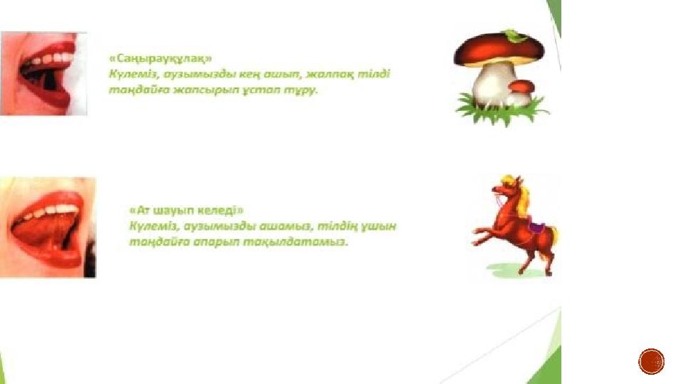 — ЕРІН АЗДАП ДӨҢГЕЛЕНІП ТҰРАДЫ; — ЖОҒАРҒЫ,ТӨМЕНГІ ТІСТЕР АЛШАҚ КЕЛЕДІ; — ТІЛДІҢ ҰШЫ ҚАТТЫ ТАҢДАЙҒА КӨТЕРІЛЕДІ; — ТІЛ МЕН ТАҢДАЙ АРАСЫНДА АУА ТОЛҚЫНЫ ЕРКІН ӨТЕДІ; — ТІЛДІҢ ШЕТ ЖАҚТАРЫ АЗУ ТІСТЕРГЕ ЖАБЫСЫП ТҰРАДЫ; — АУА АҒЫСЫ ДЕМ ШЫҒАРУ СӘТТЕ АУЫЗ ҚУЫСЫНА ТОЛЫП, ҚАТАЙЫП ТҰРҒАН ТІЛ ҰШЫН ҚОЗҒАЛТЫП ДІРІЛДЕТЕДІ; Алдымен «Р» дыбысының артикуляциясына назар аударамыз: