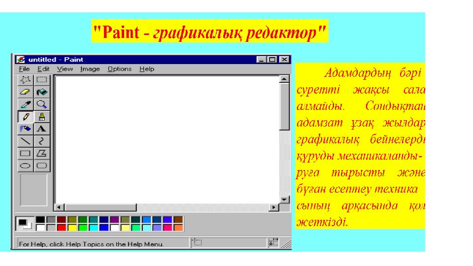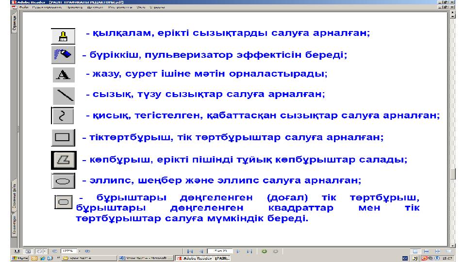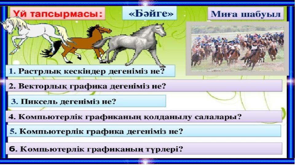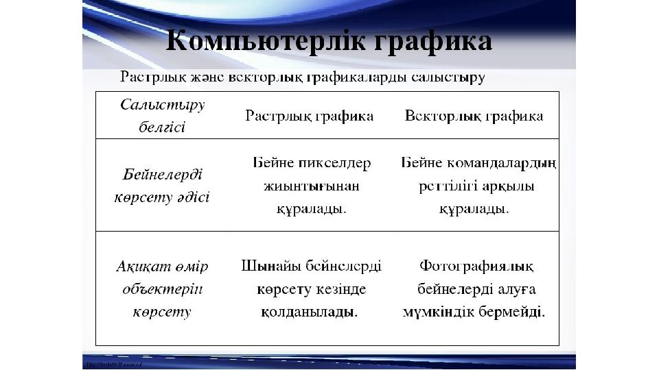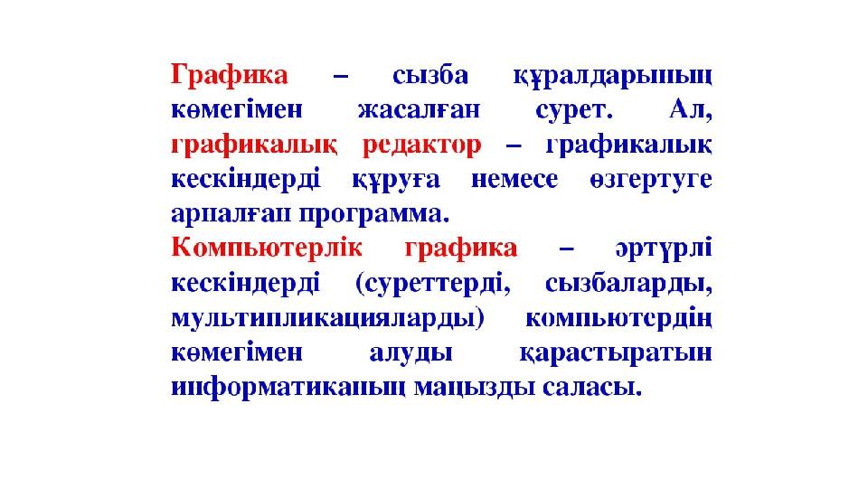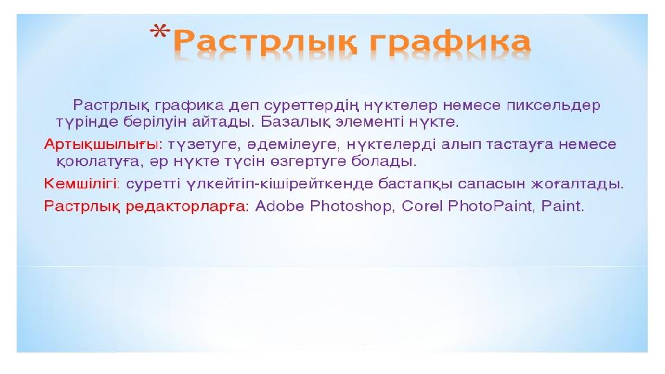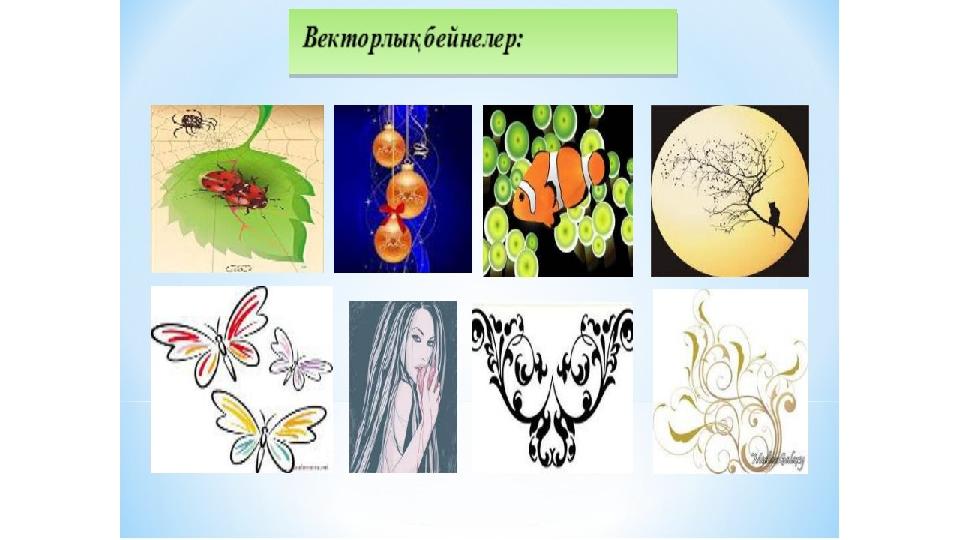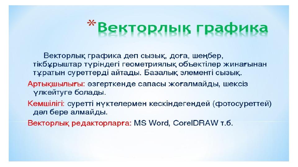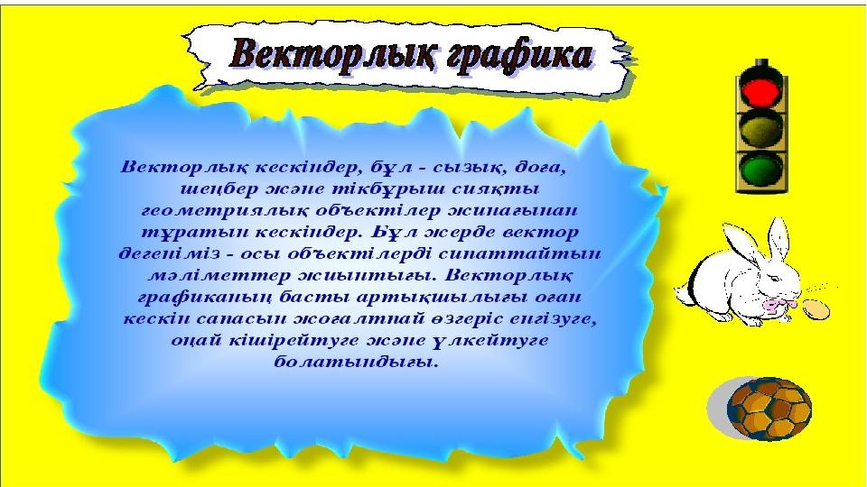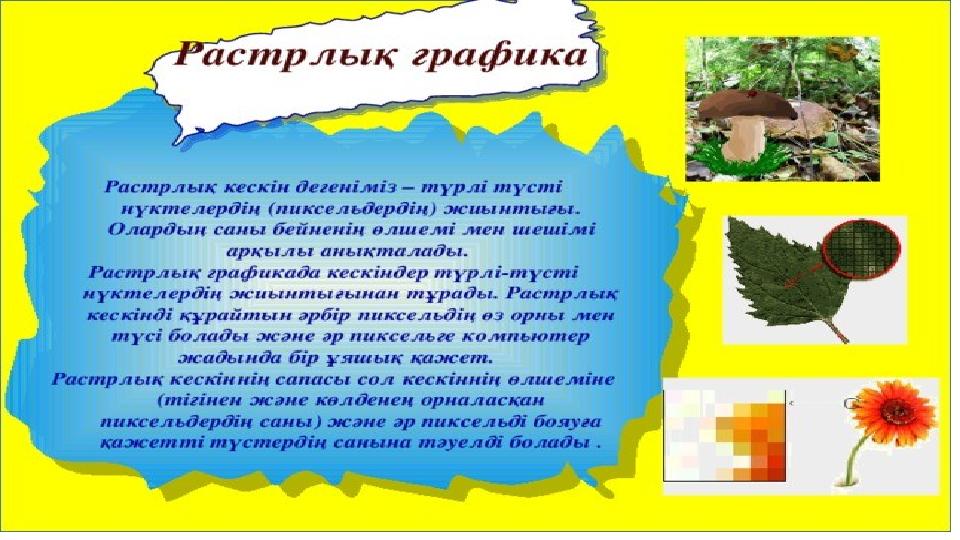 Сабақтың мақсаты: Компьютерлік графика ұғымымен таныса отырып, графиканың түрлері туралы білімдерін қалыптастырып, растрлық және векторлық графиканың артықшылықтары мен кемшіліктерін меңгеріп түсінеді Сабақтың тақырыбы: Растрлық және векторлық графикалық редакторлар